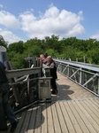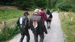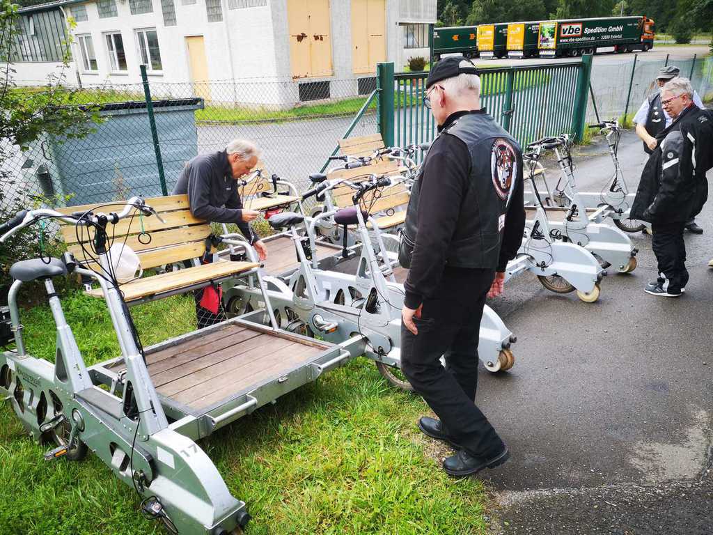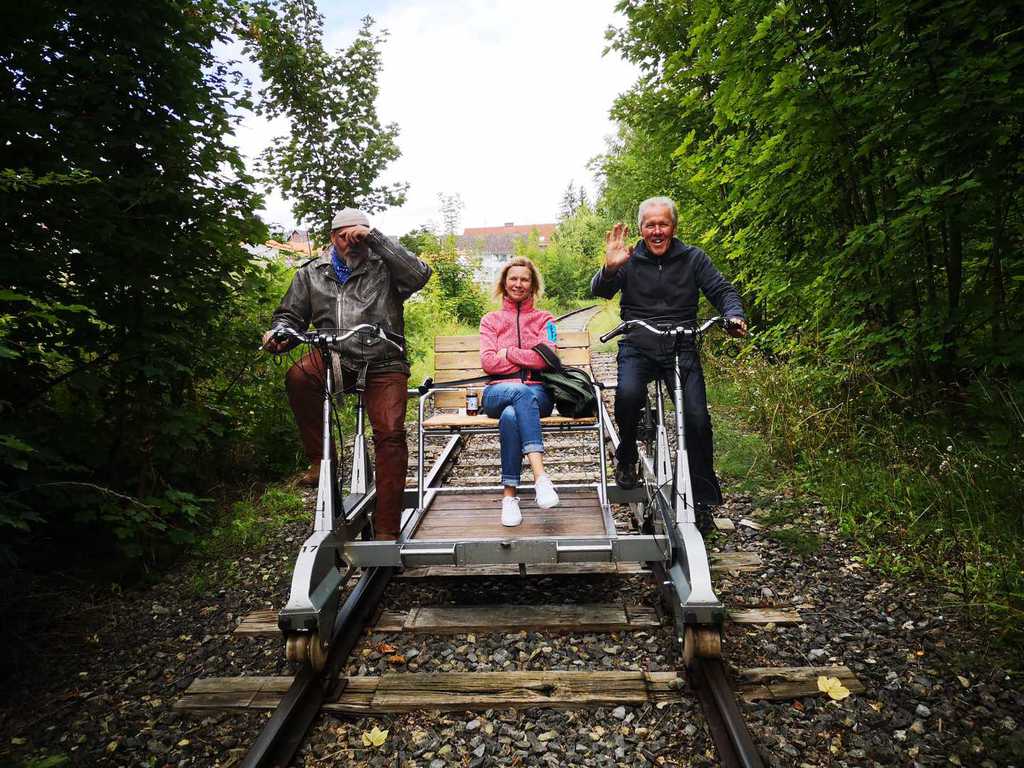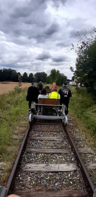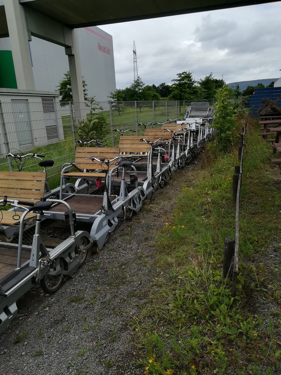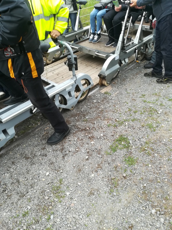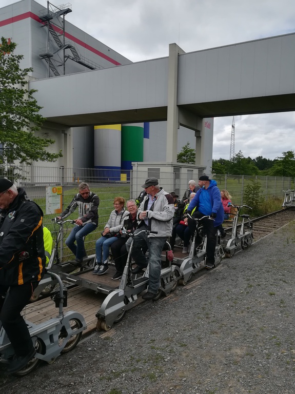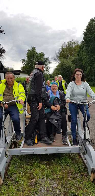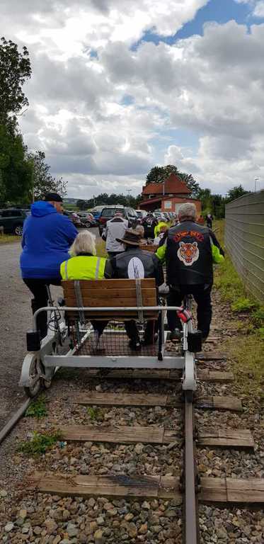 Immer 4 Personen auf einer Draisine, zur Info: Gewicht 90KG,7-Gangschaltung und Akku, und los ging der Spaß.......leider gab es an Bord kein Sauerstoffzelt, das hätten sich einige der Fahrgäste wohl gewünscht....