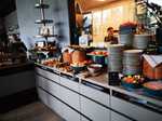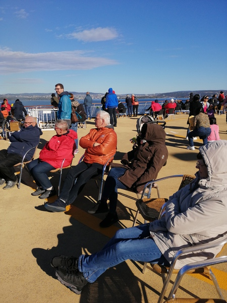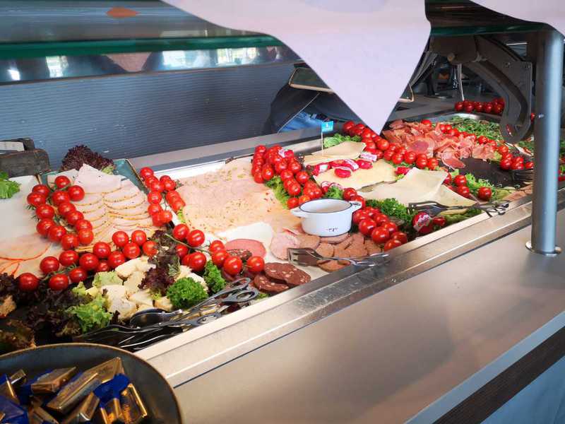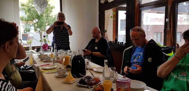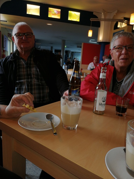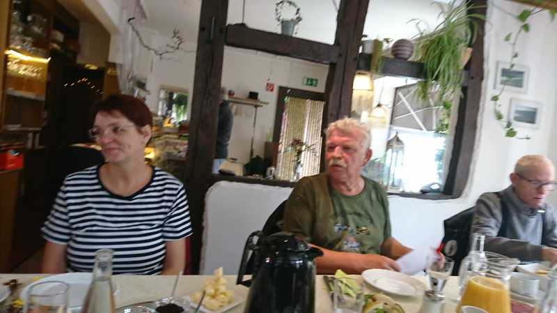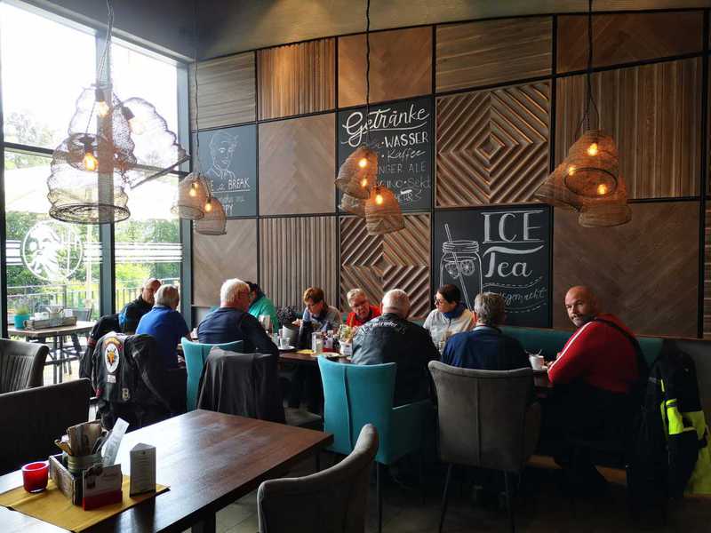 Dort war eigendlich ein kurze Kaffee Pause geplant. Im Restaurant war aber ein Buffet aufgebaut......Boah echt Hammamäßig.....und obwohl wir alle zu Hause gefrühstückt hatten stürmten wir das Buffet....es gab soviele leckere Sachen...Currywurst-Pizza-Kuchen-Brötchen-süßes und würziges-Eier gekocht und Rührei und Spiegeleier-Obst und Gemüse und noch vieles mehr...... dafür schon mal ,Daumen, hoch.
