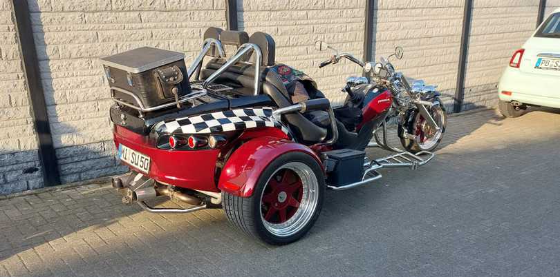 Dieses knallrote Boom Trike wird von Anke und Josef gefahren